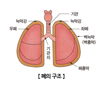 폐는 오른쪽이 세개의 부분, 왼쪽이 두개의 엽으로 나뉘어져 있고 흉막이라는 두 겹의 얇은 막으로 둘러싸여 있습니다.