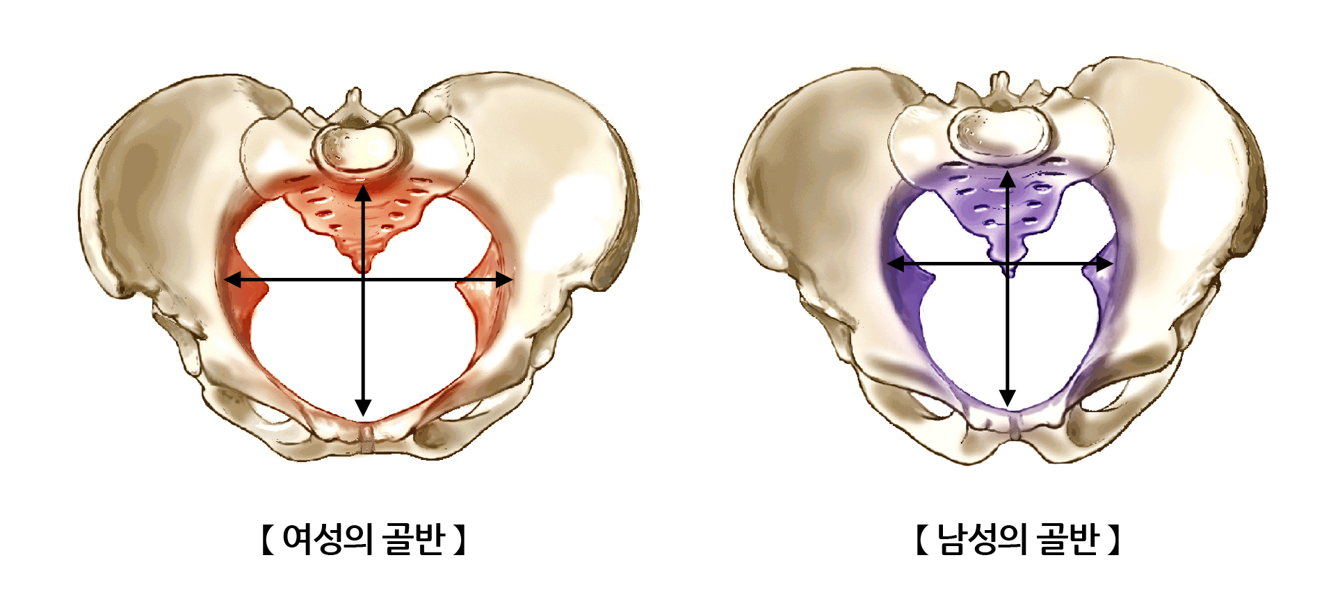 여성은 분만을 해야 하기 때문에 남성의 골반과 구조적으로 다릅니다. 여성의 골반은 남성의 골반보다 더 넓고 짧아 골반 내 공간이 더 넓습니다. 남성의 골반입구는 심장모양인 반면 여성은 넓은 타원형이고 골반출구도 더 넓습니다. 출산시 아이의 머리가 나와야 하기 때문에 천골은 뒤로 더 기울어져 있습니다.