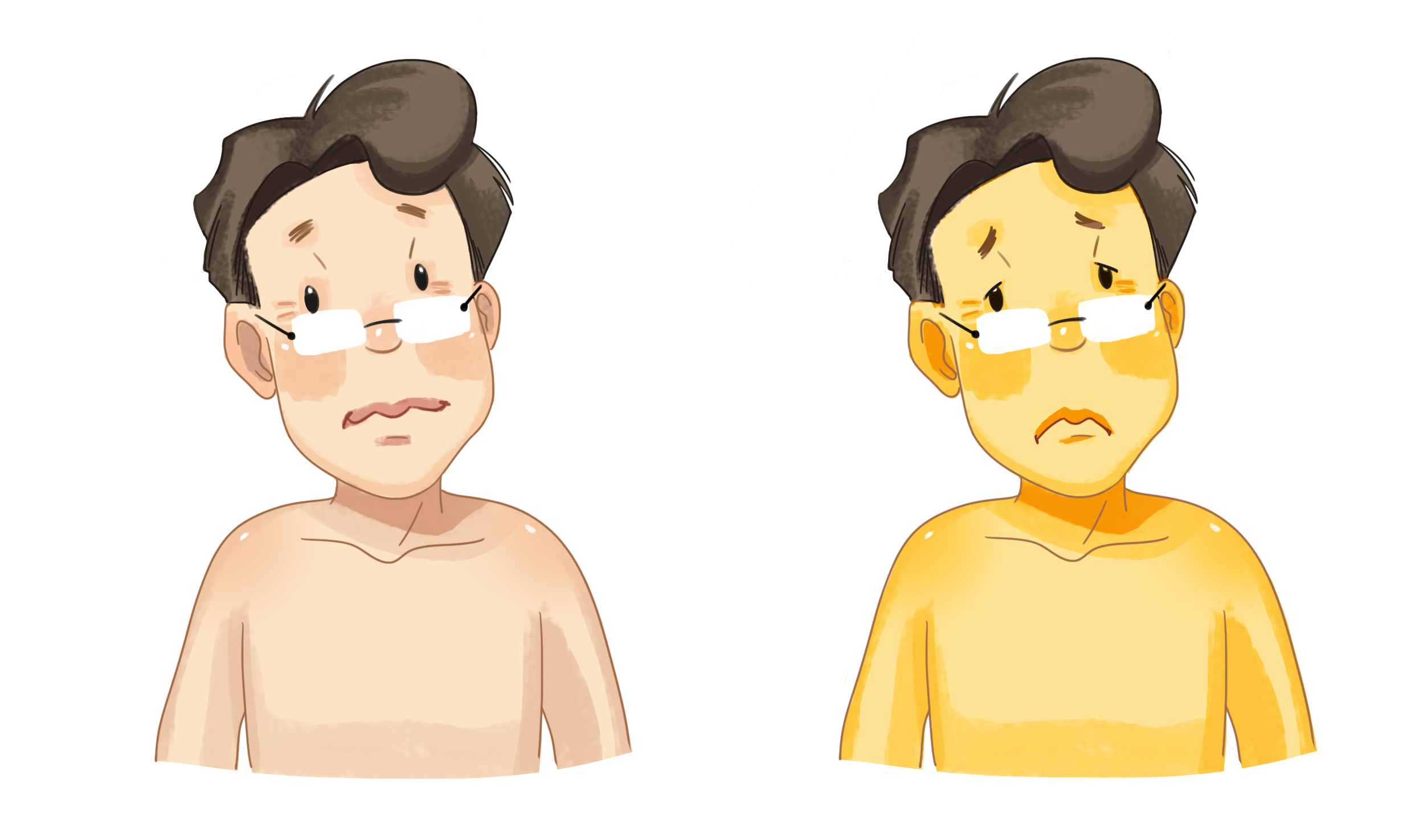 연한 간조직이 굳어지면서, 그 범위가 넓어지는 간경변증과 퇴행성 결절이 생깁니다. 빌리루빈의 양이 과도하여 피부가 노랗게 되는 황달 증상이 나타납니다.