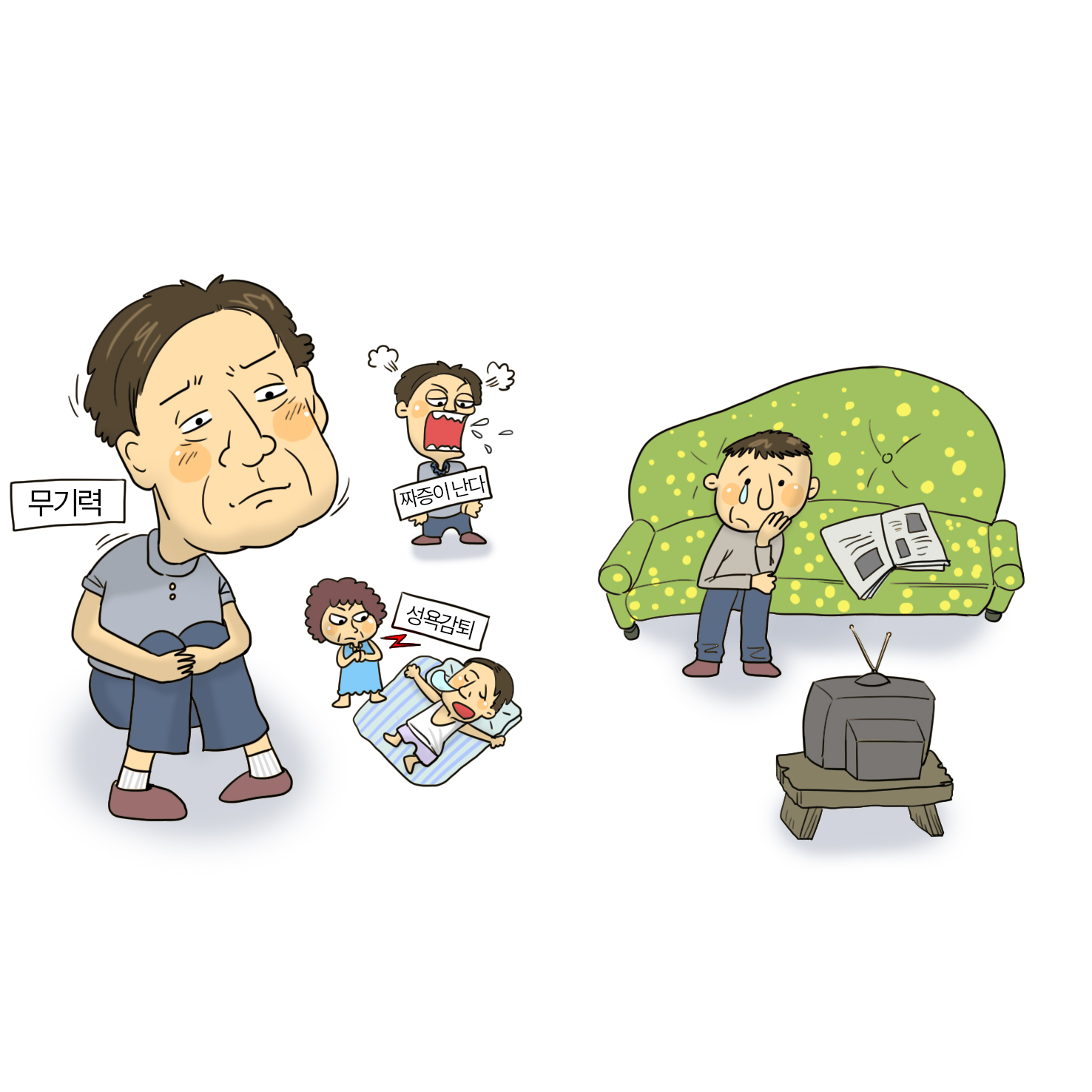 남성 갱년기 증상은 성생활과 관련된 것이 먼저 나타납니다. 성욕 감퇴, 발기부전, 성관계 횟수 감소 등 성 기능이 감소하는 양상을 보입니다. 그 외에 원인을 알 수 없는 무기력감, 만성 피로, 집중력 저하, 우울증, 불면증, 자신감 상실, 복부 비만, 체모 감소, 근력 저하, 관절통, 피부 노화, 안면홍조, 심계항진, 발한, 골다공증 등이 나타납니다.