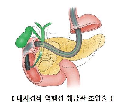 내시경 역행 췌담도 조영술은 내시경과 방사선을 이용하여 시행하는 검사로 내시경을 십이지장까지 삽입하여 십이지장 유두부의 구멍을 통해 담관 및 췌관에 조영제를 주입한 후 담관과 췌관의 구조와 비정상적인 병변이 있는지 관찰하는 검사입니다. 내시경 역행 췌담도 조영술은 담관과 췌관의 구조와 병변을 확인할 뿐만 아니라 필요에 따라 조직검사를 위한 검체 채취도 가능하고, 담관의 결석을 제거하고 담즙의 배액하거나 담관 폐쇄의 치료를 위해 시행할 수도 있습니다.